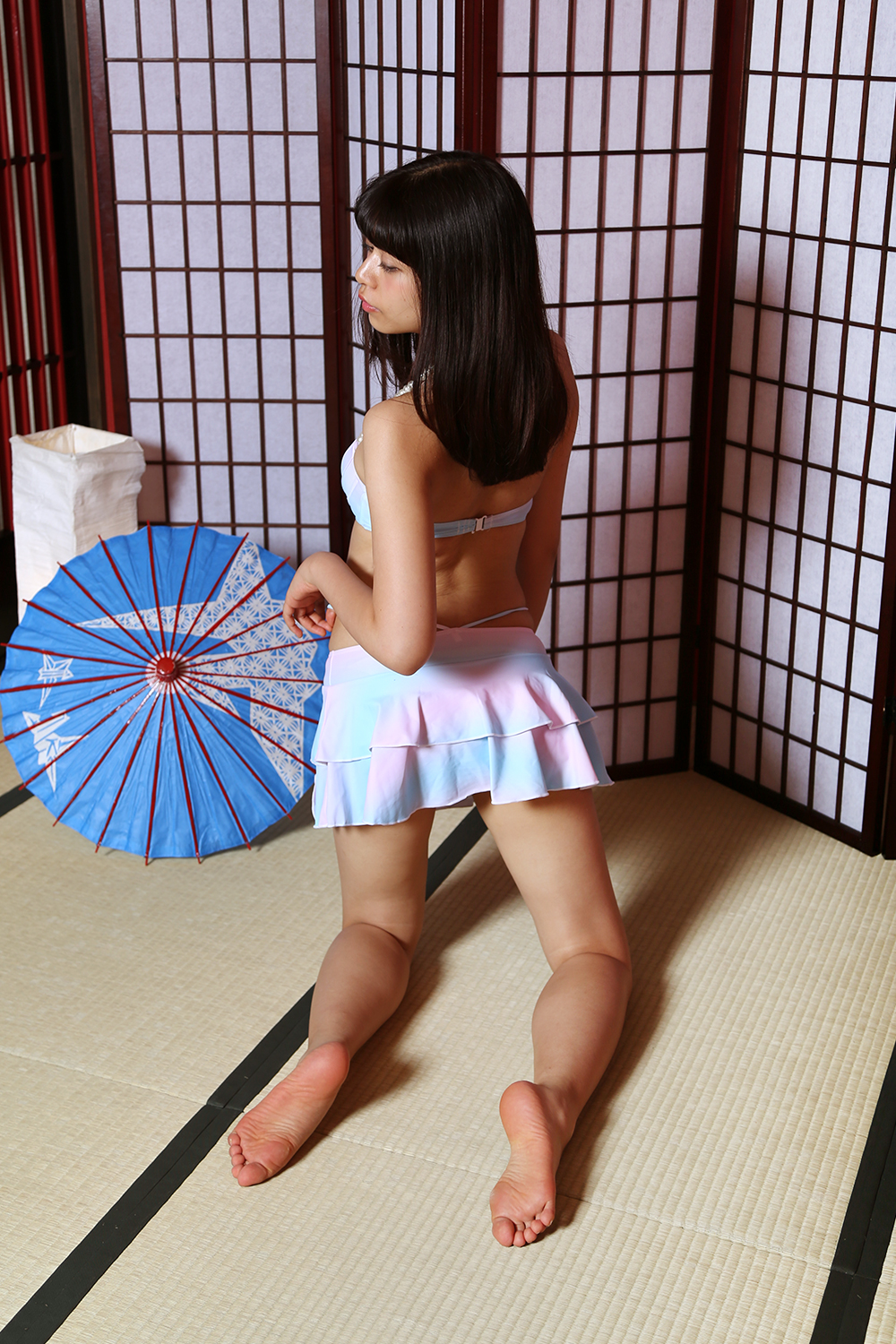 お腹部分にタオルケットなどをかけて、お昼寝シチュエーションにも使えそうです!和室で水着というなかなか無い組み合わせですが、グラビアの定番だったりします!