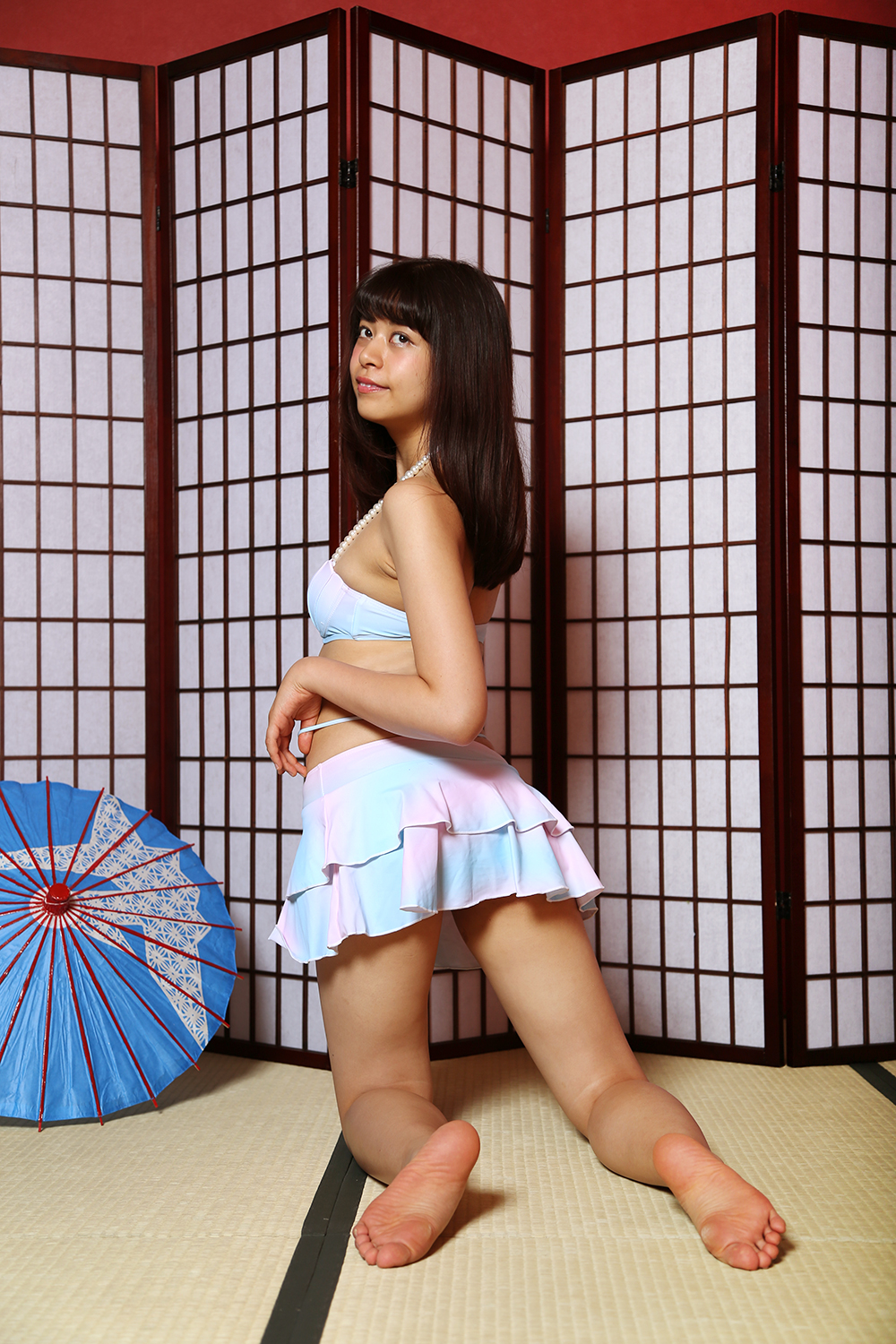 水着も着替えていただいて。和風な小道具のあるところでひざ立ちふり返りをしてもらいました。