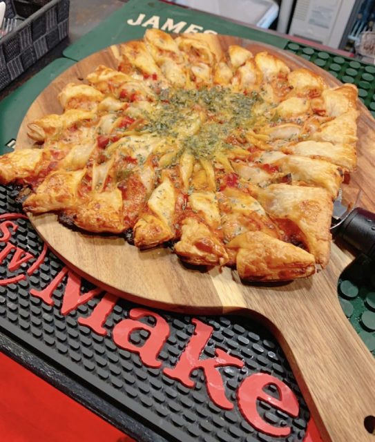 このピザは、サクサクのパイ生地でできており、ソースも手作りしているんです!