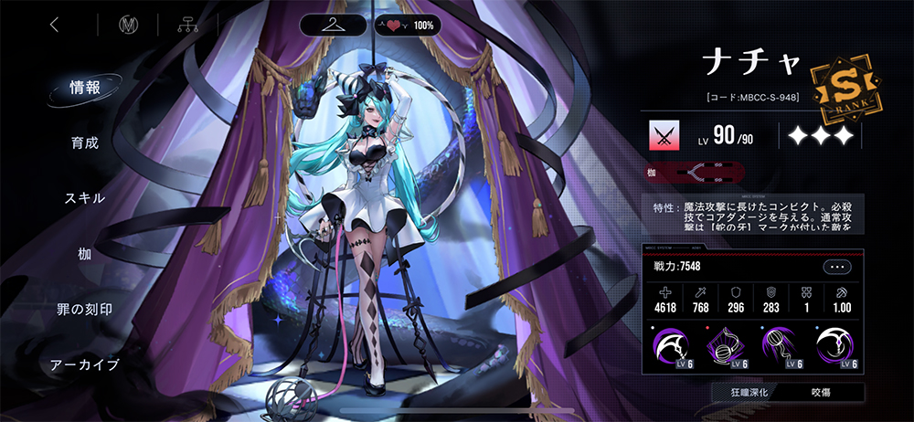 この一画面だけでも、キャラクターの名前、ランク、レベル、特性など、