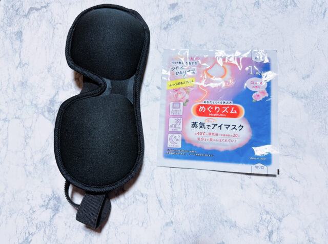 右のアイマスクは蒸気でホットアイマスクです。