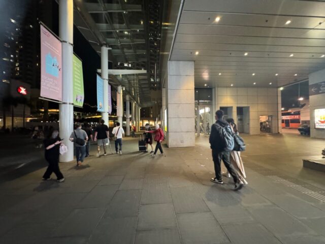 写真右側がバスターミナル、そして左側の赤いマークが香港MTRの駅です。