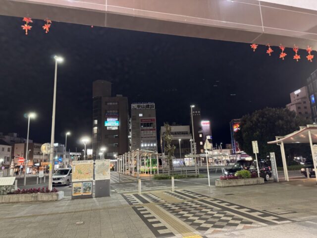 東口を出ると、正面にタクシー乗り場とバス乗り場が見えてきます。