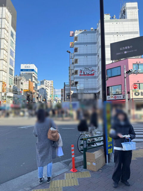 目の前の横断歩道を渡り、そのまままっすぐ進みます。